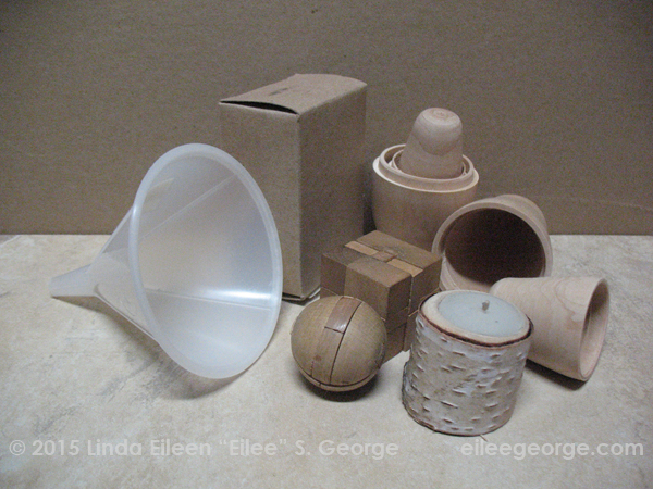 Draw a light outline of the still life once you have the objects arranged in a way that pleases you. Don’t do heavy cartoon outlines; that will flatten things no matter how well you shade them. Save that for more expressive work down the line, if you decide to get all political or emotional about things. For now, let’s just learn to draw what we see – and we don’t see lines around everything in real life; this is just a little guide for you to shade up to, either on the object, or on whatever’s behind it, depending on whichever is darker. You can see in the adjacent illustration that there isn’t even much contrast between the box and the background. It’s up to you whether you want it to stay that way or punch it up to make the box stand out a little more. Take note of the pattern in the tile and the texture on the candle, and the differing wood grains in the puzzles, and the slightly shinier reflectivity as well as the partial translucency of the funnel. And study the different shadow appearances. You’ll note shadows act differently in hard light than in soft light, or in areas with multiple light sources (even more exciting when those light sources are different colors, but let’s not get too advanced yet).