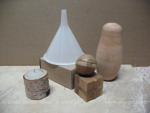 So let’s set up a little still life for you to draw – just regular household items that are representations of the basic shapes as you can find them. It doesn’t matter if you have the same things as I use in my examples; it’s the principles that I point out that are important. If you don’t have a tennis ball, try an orange, or a baseball, or whatever simple spheres you can find that have just a little texture or pattern to them. Grab a roll of toilet paper, a can of beans, a short can of tuna, or some other simple cylinder. Grab a party hat or a funnel or a megaphone or whatever odd cone you have around your place, or make one with a piece of paper and some tape. If you’re desperate, a lampshade might work. Boxes should be abundant in your pantry and all over the house. Just try to find good representatives of each of the basic forms, that are of a size that you can work with. If you can get these things in a solid color, that’s best for the beginner. The fewer patterns and printing on them the better, but feel free to experiment with that if you are more advanced or feel adventurous or confident (practice is always good). Scattered through this I’ll put some still life setups that I gathered. At first the photos will be rather monochromatic (shades and tints of mostly a single color), to ease the translation into a graphite pencil drawing (or charcoal, etc.)