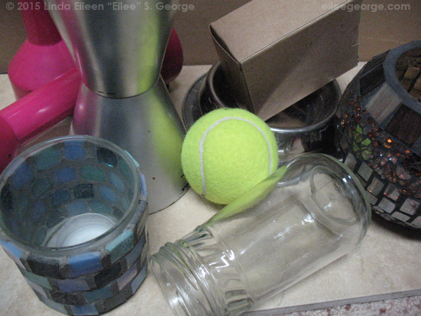 Put the items on a table under a light source, and study how the light and shadow wrap around them. Note how the light and shadow and the gradation between them change depending on how smooth and how reflective they are. Shiny things have stark reflections without a lot of gradation between light and dark. Dull things have a more gradual and even transition between light and dark.