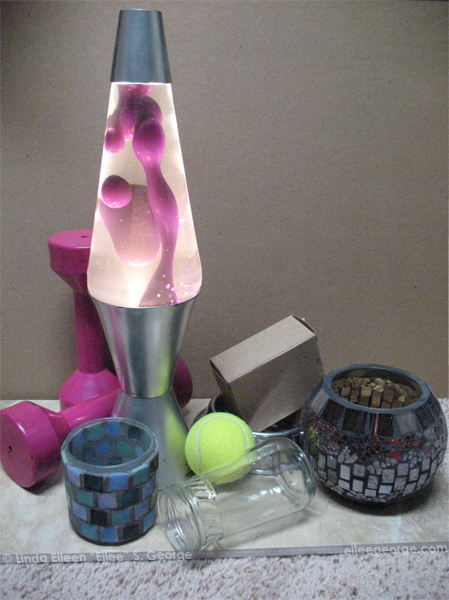 Here are some more photos of objects that show how they reflect upon each other in more detail. Note how the glass jar refracts and warps the shape of the tennis ball as you view it through the bent glass. Note how the reflection of the tennis ball is a duller yellow in some of the objects near it because of those objects’ local color mixing with that reflection, making a relative color. (Local color and relative color are also discussed in the Shape lesson.) See how the silver base of the lava lamp is dull rather than a mirror finish, and how it tones down the color of the objects that it reflects. Notice the reflection on the box from an area we can’t even see from this angle. In the other photos above, note how shadows act under the jar, as they recede away from more opaque objects – they go from sharp to blurry as they go away from the object that casts them (for instance, under the weight). Look at how shiny objects’ reflections are very sharp and sudden, but the highlights on dull objects are smoothly gradated.