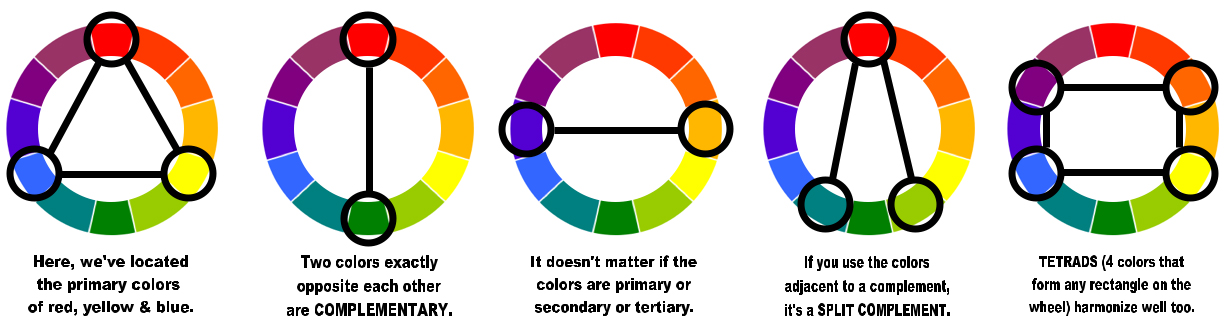 Colors that are next to each other on the color wheel are called analogous colors. Examples of analogous color scheme would be blue-green, blue, and blue-violet. Analogous colors are harmonious together and do not contrast strongly against each other. There are lots of ways to use colors together:
