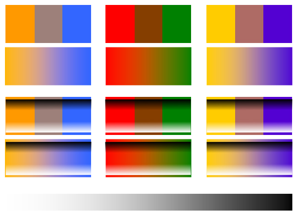 Intensity is a property of a color in relation to how pure it is, versus how much of its complement has been added to it. To really understand this, we must refer to the color wheel again. Note that red and green are complements. If you were to add a little green paint to a lot of red, you would take down the intensity of the red; it would be a less pure, less intense, less true red. (Note that in some texts the word “intensity” is replaced by the word “chroma”; they are the same thing.) Likewise, if you were to add a little red to a lot of green, it would be a lower-intensity green. Any mixture of complements is known as a tone. You can vary the amounts of each of the complements to achieve any tone you wish that is in the range between those two complementary hues. When you reach equal strength of pigment (your colored paint), then you should (ideally) have something close to black (you usually have to tweak it a bit). On either side of black in that middle ground should be some rather muddy-looking colors that possess very low intensity, and are difficult for many eyes to distinguish from what most would consider simply ugly browns. You can see this in the rectangular illustration below to the left. What you get in the middle depends on how much of which colors you’re mixing. It is significant to note that the value contrast between complements yellow and violet is far different to that between, say, red and green. Yellow particularly is not a very strong color in pigment and by its nature is a very light value compared to other primary and secondary colors.