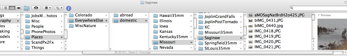 I take tons of nature photos for paintings. Since I have so very much content on my laptop, and since I’m a tad obsessive-compulsive, I’ve developed a consistent abbreviated nomenclature in my filenames that uses partial keywords that I can search, in order to find all of the photos in that category. Let’s say I took a photo on Mount Evans that has mountains in the background, forest and a stream in the mid-ground, and a flower in the foreground. The camera-assigned filename we’ll say was originally “IMG_7211.jpg”. The new filename would include MtEv for Mount Evans, Mtn for mountains, 4st for forest (or Tr3 for tree if one is dominant), H2o for a water feature, and Flr for floral. It was originally from 306CANON folder, and was taken in May of 2014. All the photos in that folder would be in a folder renamed “306c14MaMtEv”and the file would be renamed “MtEvMtn4stH2oFlr211.jpg”. The 211 is retained because I may have taken 20 pictures within that folder that have those same features in different configurations, and they can’t all have the same exact filename. The folder name retains the 306 because I may have gone to Mount Evans 3 times in the same month and I’m remembering visit number two. The “c” (from CANON) after the 306 is just there to separate it from another number: the 14 representing the year. Note that in my ‘feature’ abbreviations, each starts with a capital letter and ends in a lower-case letter or number (e.g., Mtn, Tr3, H2o). This makes it easier to distinguish between each abbreviation when looking at the file name as a whole. I try to keep each to three characters but sometimes four are necessary to discern what the abbreviation stands for as opposed to another one. I do keep a cheat sheet of abbreviations to refer to in case I forget or develop a new one, so I always use the same one consistently.