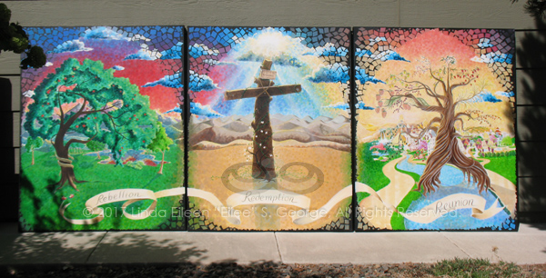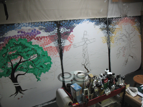 On April 29, 2017, artist Eilee George dedicated with Calvary Community Baptist Church of Northglenn nine new works, many of massive proportions, depicting significant sites in the walk of Jesus, and including a triptych featuring three key trees in the Bible. Knowing that people often want to know the background, reasoning, symbolism, technique and inspiration for works in order to make a deeper connection with the art being viewed, the Church asked the artist to give a presentation explaining the works in the context of meaning and method.