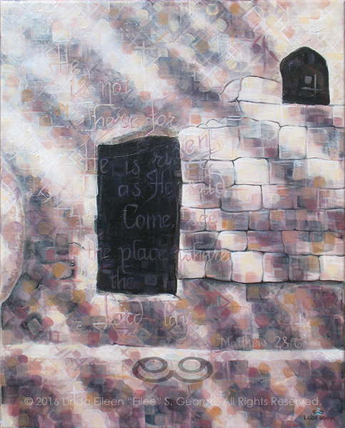 Detail of the Garden Tomb painting with its scripture: “He is not here, for He is risen, as He said. Come, see the place where the Lord lay.” – Matthew 28:6 – painted in a fractured, pixelated style in beige, ochre, cream, plum, mauve and gray